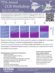 The FREE ONLINE Annual Workshop on Computational Cell Biology (CCB) will take place March 16-20, 2026 is organized by the Center for Cell Analysis and Modeling at UConn Health. The course (the tentative schedule https://vcell.org/wp-content/ uploads/2025/12/CCB_ announcement-2026.pdf) will combine lessons on modeling techniques (ODE, PDE, stochastic, spatial stochastic, agent- and rule-based modeling with BioNetGen and NFSim) using VCell (http://vcell.org/), COPASI (http://copasi.org/) and SpringSalad (https://vcell.org/ssalad), and interactive hands-on sessions using software to design your models and perform simulations. The project track is intended for participants who already have modeling projects. To be included in the project track, please submit a description of your project explaining how VCell, COPASI and/or SpringSalad will help your research project to Dr. Michael Blinov blinov@uchc.edu. This info will allow us to determine if the current implementations of our tools apply to your project. Participants in the project track will also be required to give a short presentation about their project on the first day.